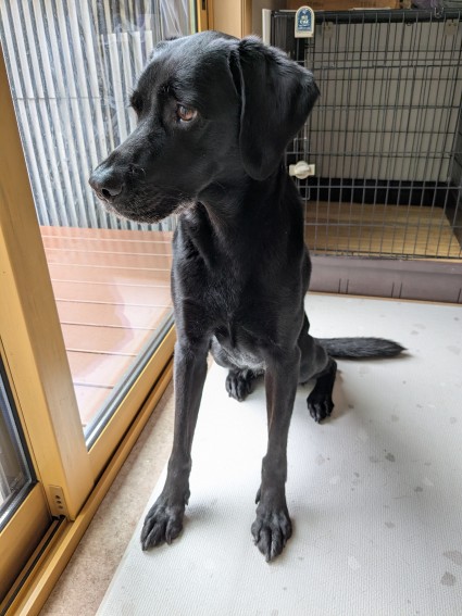 たすちゃんとわさびのリードをテラスの柱にひっかけて