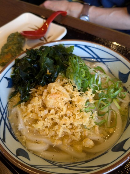 夫は旨塩うどんに無料の天かすとネギワカメたっぷり