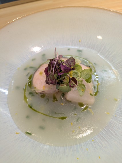 備長炭で皮目を焼いた鰆と大根、じゃがいも、酢橘