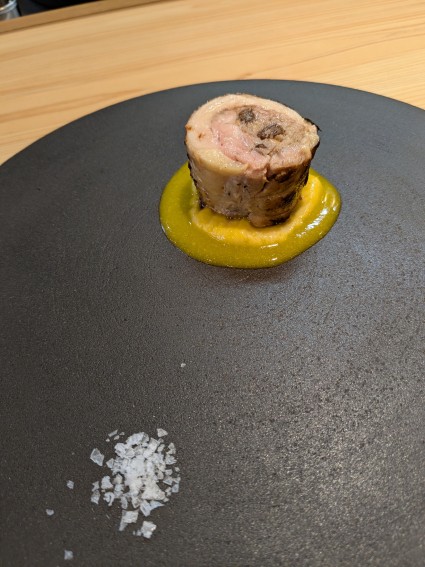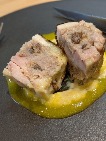 マッシュルームのデュクセルを詰めた銀山赤鶏のロートロ