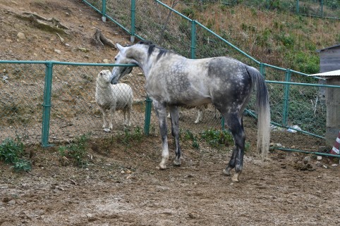 フェンス越しにウマさんとヒツジさんのランデブー(笑)