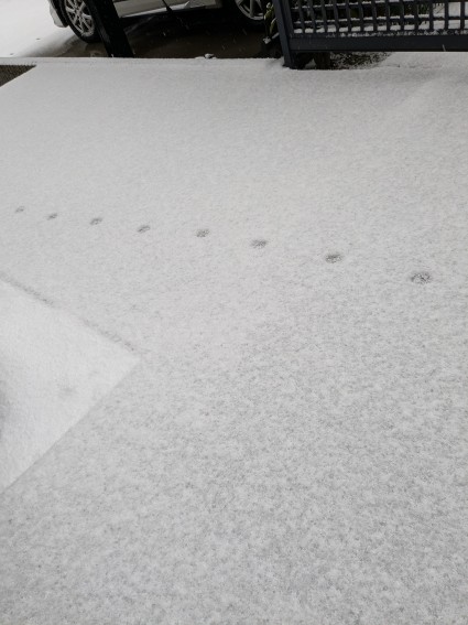 雪が降った朝、玄関アプローチに足跡が点々と・・